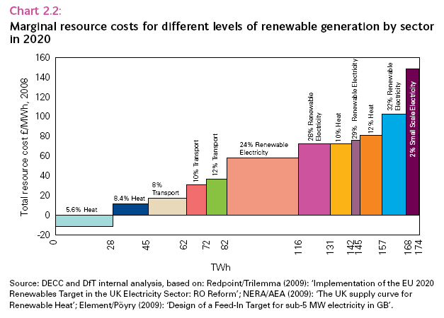 Perhaps I am holding them to too high a standard, and the mustard-yellow block is (for example) intended to contain all potential renewable-heat projects with marginal resource costs between £15 and £70/MWh. But in that case, why does the chart distinguish consecutive blocks of transport energy with marginal-resource costs of £20, £35 and £40/MWh (approximately, see the third, fourth and fifth blocks in the graph)? Couldn't they all have been lumped together like the 10% (mustard-yellow) heat block, or the 24% (sixth, salmon-coloured) electricity block? And doesn't this contradict Government policy on support mechanisms, which tries to tailor the support-level to ensure that projects all get only just enough to make them viable (projects of each technology being consistent in cost and the Government's knowledge perfect).